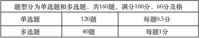 題型為單項選擇題140道,每題0.5分,多項選擇題30道,每題1分,滿分100分,60分以上(含